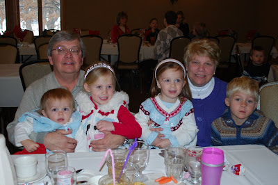 Today we went to the Santa Brunch at Majestic Oaks Golf Club near our house with my parents and my sister's family. For you locals, I would highly recommend it. It is a wonderful breakfast buffet with tons of food, omelet stations, waffles stations, kids buffet, and pictures with Santa and Mrs. Claus. As you know from earlier post, Maria didn't care for Santa, the buffet made up for it. She was free of charge, and I assure you they are rethinking that after the Maria Feeding Storm came through today! We exchanged gifts from the cousins and had a really nice time. I smell another tradition in the making....